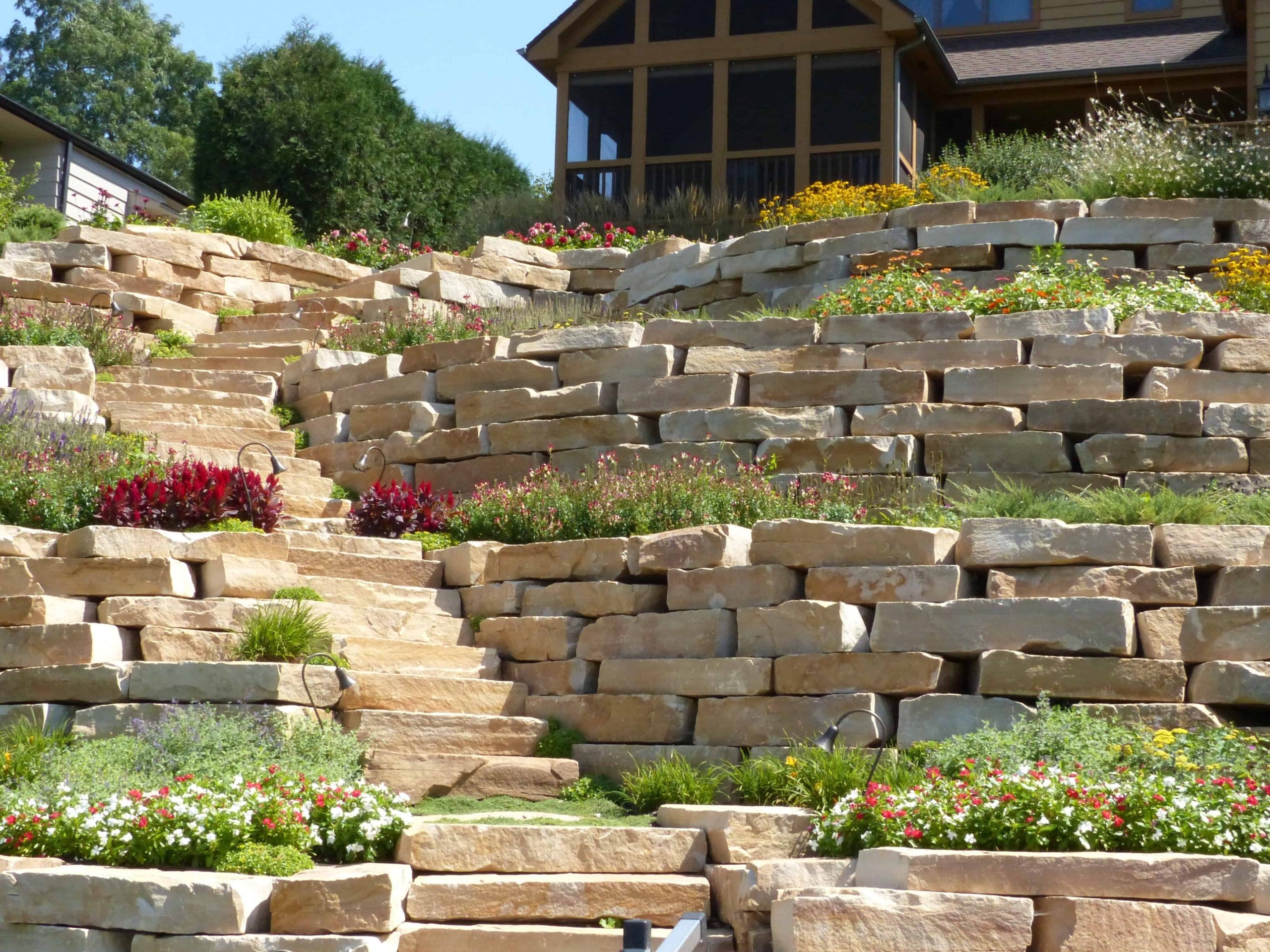 At the top of the wall, sun-loving annuals and herbs can be traded out from year to year, adding a fragrant and useful touch to the landscape. Here, red and white impatiens and emerald-green basil fill the bill. As one descends along the steps to the planting beds, small shrubs and colorful perennials are the focus. Primary colors dominate—including Celosia with red plumes and leaves, golden black-eyed Susans, blue Russian sage—with some bright whites and a range of green foliage to add variety. Lower-height plant materials were selected to let the stonework take center stage, with plantings adding pops of color throughout.
