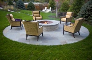 A more formal approach would be a dimensional bluestone patio with a mortar stone fire pit. This style is definitely one of the more popular options.