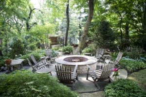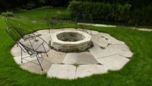 A little more permanent than a gravel seating area – here’s a tight jointed flagstone patio with dry stacked stone fire pit. Love the chairs!!