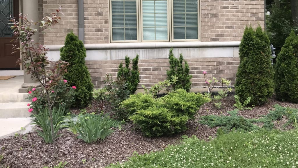 In this area let’s discuss the low growing evergreens (Juniper). There are two different kinds here next to a variety of other plants that are just scattered randomly thought out this bed. Junipers are very useful in a landscape when they are retaining soil on a sloped area. They are not the most attractive plant so I would not plant them near the front door or walkway. We transplanted all of them to the back around the existing patio where there was an existing slope. A few other plants that are good for sloped areas are: Gro-low Sumac, Cutleaf Stephanandra, Summersweet, Daylilies, Coneflowers, and Russian Sage.