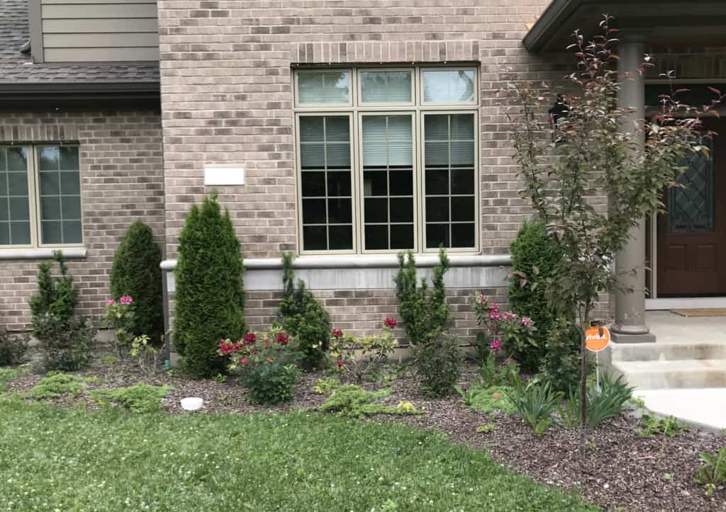 These pyramidal evergreens, (Arborvitae) are planted too close to the house. If left alone, they will need to be pruned back every year in order not to become a maintenance issue. Try to keep in mind the plants mature size before planting anything. You want each plant to grow gracefully in their new location vs. pruning back year after year and changing its natural habit. Between the arborvitae, hick yews were planted. As you can see the tops of them are very wild and have not been trimmed back. Hick yews are a perfect plant choice when trying to hide or screen something unattractive. In this case, we transplanted them all around the AC units to make a ‘living fence’.