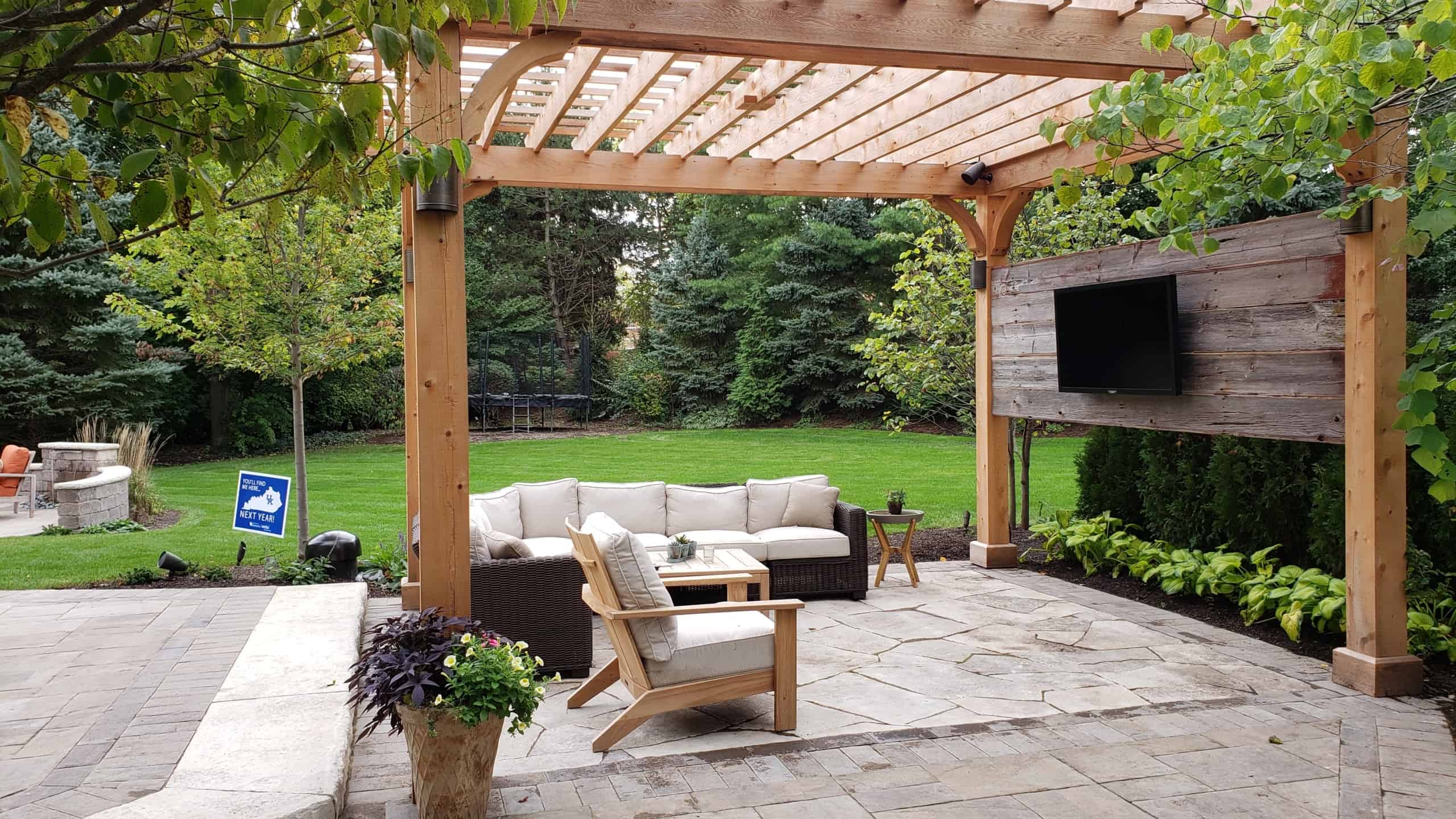 In designing this space, a priority list was compiled after the initial introduction meeting. After contracting with the clients for a landscape design phase, we developed a preliminary concept plan, integrating the elements that were important to the clients. Through the exploration of the area available for development in scaled landscape design, the client identified a target space they felt most comfortable. The preliminary concept was then modified to place a greater focus on spatial development in this area. We worked together to conceptualize a backdrop, which would provide privacy as well as present an opportunity to mount a television and set up a sound system. What we ended up doing was integrating a wall on one side of the planned pergola and using reclaimed barnwood, mounted to a treated timber frame, to give a practical backdrop and create a pleasing aesthetic.