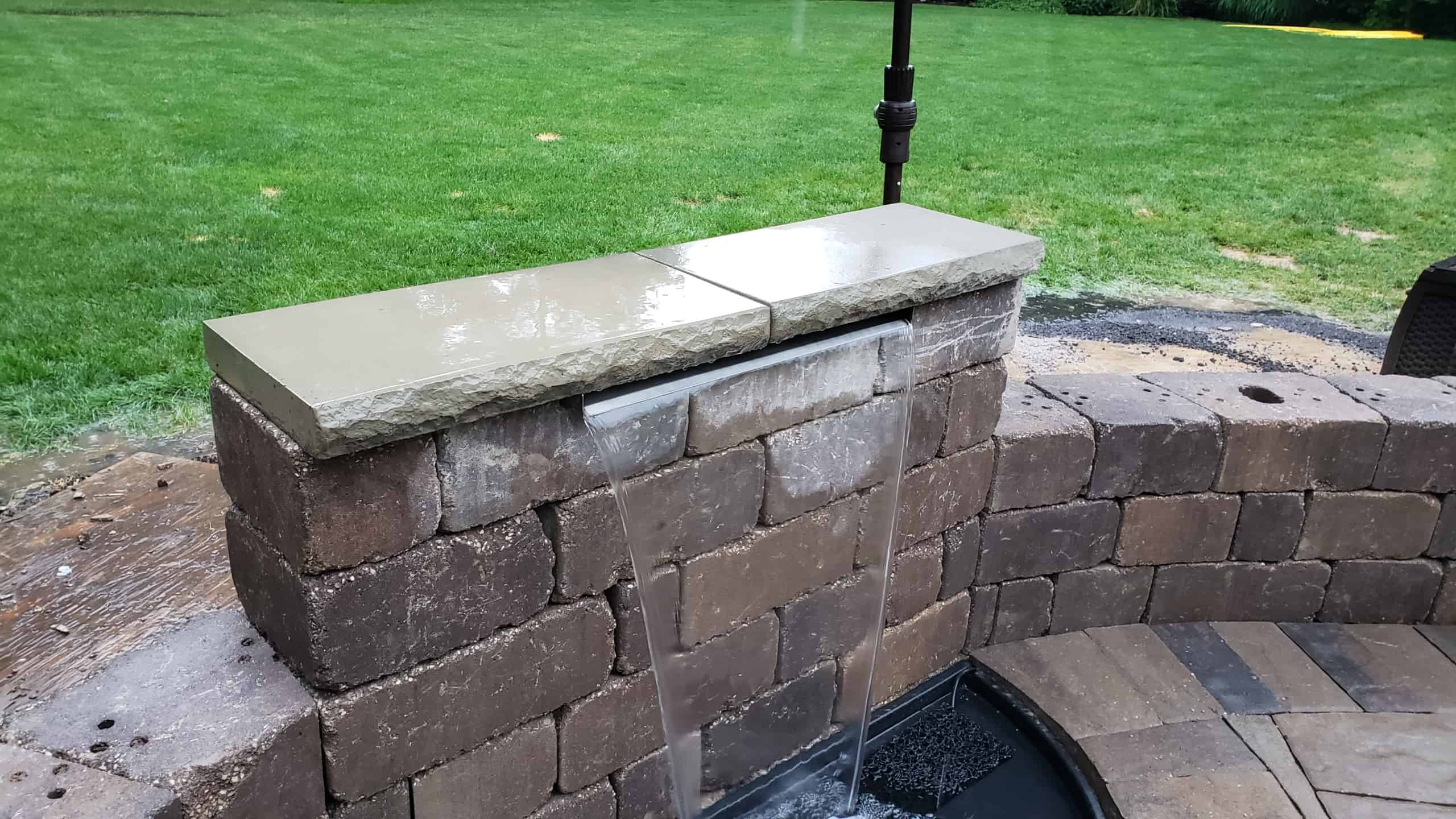 Besides the entertainment area, the priorities on this outdoor room included; an area for grilling and serving food, a space for a fire pit or fire table, shade due to a glaring southern exposure and utilization of large format stone or concrete pavers/landscaping bricks. Additional priorities included a privacy planting to cut views from the road out, planting of beds surrounding patio space for color and to soften the large area of hardscape. Integration of flagstone into the paving concept to bring elements of the front yard landscaping to the rear yard and a water element for sound and movement.