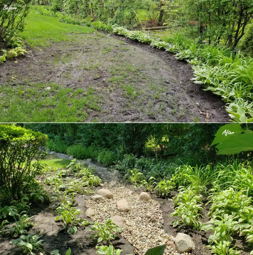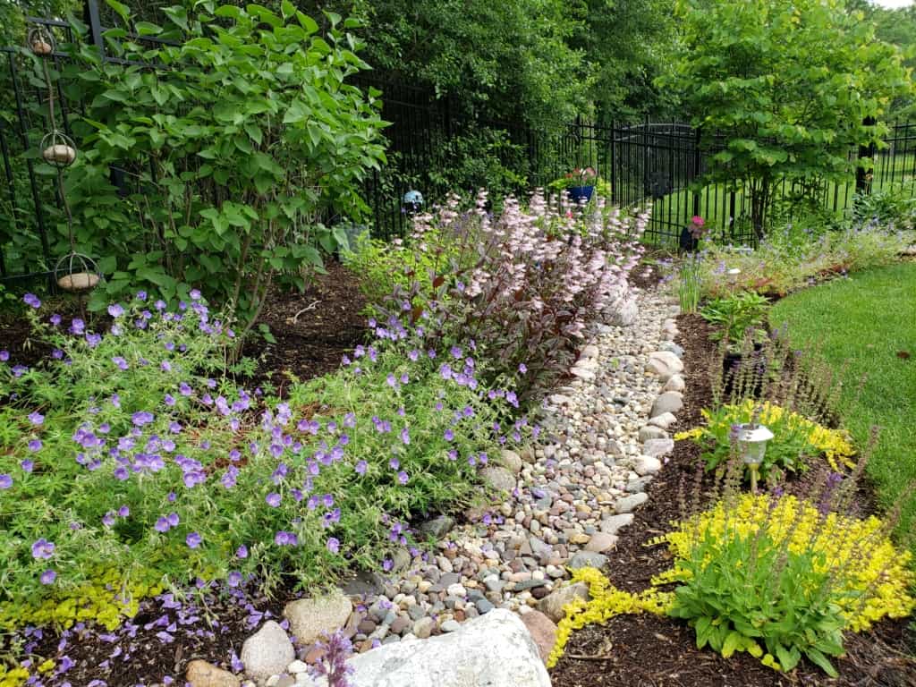 Once the intended plant material fills in the areas surrounding the new dry stream-bed, these become easy to maintain areas of the property and successfully move water away from the house into a practical and legal outlet area, improving the landscapes function and value.