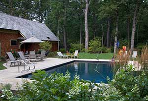 The bluestone pool deck feels less formal bordered by loose, natural drifts of hydrangea.