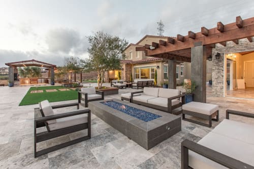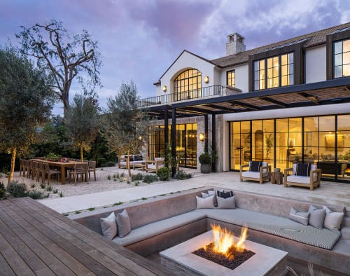Drought-prone areas can still have welcoming, attractive outdoor living spaces. The backyard space for this French transitional home features multiple seating areas where the homeowners can enjoy a cup of coffee in the morning or an impromptu dinner with friends in the evening. A mixture of textures—stone, pavers, and wood—create visual interest. And the sunken firepit area with built-in seating is the perfect place for enjoying an after dinner glass of brandy or a single malt Scotch, relaxing and looking up at the stars.