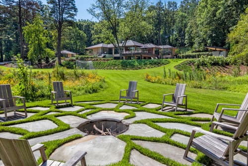 If you’re working with a large backyard space, the sky’s the limit when it comes to your options. This backyard patio features stone pavers interspersed with lush grass, creating a visually interesting area that echoes the organic shapes of the home’s flowerbeds and landscaping. The sunken firepit allows the homeowner and friends to enjoy a cozy evening together, sharing laughter and stories.