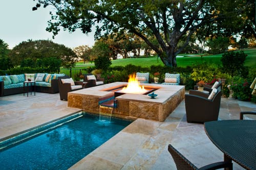 Looking for a truly dramatic way to add a firepit to your space? Consider mixing two elements—fire and water—into one cohesive feature. This project combines a Tuscan lap pool with a firepit that also serves as a fountain, providing a water feature and a heat source at the same time. The top of the firepit is large enough to act as additional seating, or can serve as a table on which to place appetizers and beverages.